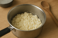 - Do hrnce přidejte tapiokovou mouku a sůl. Vznikne divná hrudkovitá směs, která vypadá, jako by se vám nepovedla. Nebojte se, má to tak být! (Aspoň doufám. Video na YouTube vypadalo podobně katastrofálně.)