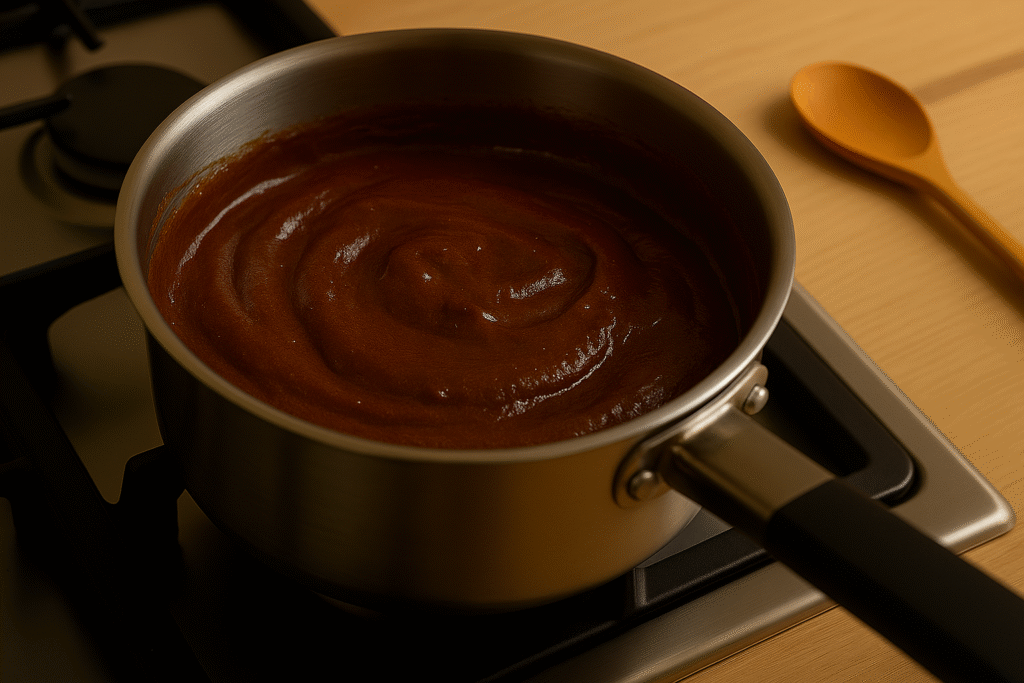 - V menším kastrolu smíchejte kondenzované mléko, kakao a máslo. Na mírném plameni míchejte asi 10–15 minut, dokud směs nezhoustne a nezačne se odlepovat od dna. Pozor, neodvracejte se, jinak budete mít čokoládovou katastrofu připomínající Mordor.